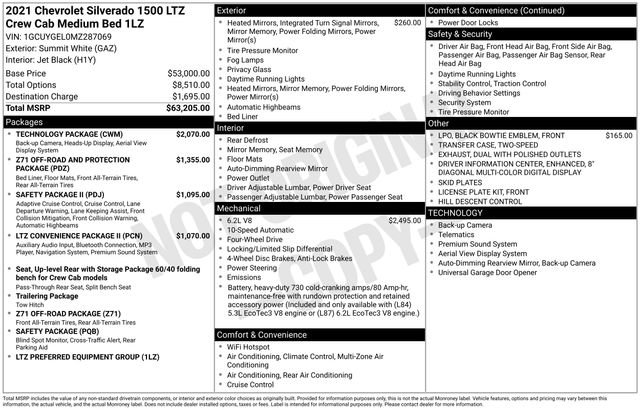 Summit White 2021 Chevrolet Silverado 1500 LTZNEW TIRES., NOT A RENTAL UNIT!, NAVIGATION!, FULLY SERVICED AND READY TO GO!, BLUETOOTH!, USB PORT!, REARVIEW CAMERA!, HEATED SEATS!, LEATHER SEATING!, Silverado 1500 LTZ, 10-Speed Automatic, 4WD, Jet Black Leather, 15 Diagonal Multicolor Head-Up Display, 2 USB Ports (First Row), 8 Driver Information Center, Adaptive Cruise Control, All-Weather Floor Liner (LPO) (AAK), Automatic Emergency Braking, Bed View Camera, Chevytec Spray-On Black Bedliner, Dual Exhaust w/Polished Outlets, Floor Mounted Center Console, Following Distance Indicator, Forward Collision Alert, Front Pedestrian Braking, HD Surround Vision w/2 Trailer View Camera Provisions, Heavy-Duty Air Filter, Hill Descent Control, Hitch Guidance, IntelliBeam Automatic High Beam On/Off, Lane Change Alert w/Side Blind Zone Alert, Lane Keep Assist w/Lane Departure Warning, LTZ Convenience Package, LTZ Convenience Package II, LTZ Plus Package, Off-Road Suspension, Perimeter Lighting, Power Sliding Rear Window w/Rear Defogger, Premium Bose 7-Speaker Sound System, Radio: Chevrolet Infotainment 3 Premium System, Rear Camera Mirror, Rear Cross Traffic Alert, Safety Alert Seat, Safety Package, Safety Package II, Technology Package, Trailering Package, Ultrasonic Front & Rear Park Assist, Universal Home Remote, Up-Level Rear Seat w/Storage Package, Ventilated Driver & Front Passenger Seats, Wireless Charging, Z71 Off-Road & Protection Package, Z71 Off-Road Package. Well Equipped with: LTZ Convenience Package (2 USB Ports (First Row), Floor Mounted Center Console, Power Sliding Rear Window w/Rear Defogger, Universal Home Remote, and Ventilated Driver & Front Passenger Seats), LTZ Convenience Package II (Premium Bose 7-Speaker Sound System, Radio: Chevrolet Infotainment 3 Premium System, and Wireless Charging), LTZ Plus Package, Safety Package (Lane Change Alert w/Side Blind Zone Alert, Perimeter Lighting, Rear Cross Traffic Alert, and Ultrasonic Front & Rear Park Assist), Safety Package II (Adaptive Cruise Control, Automatic Emergency Braking, Following Distance Indicator, Forward Collision Alert, Front Pedestrian Braking, IntelliBeam Automatic High Beam On/Off, Lane Keep Assist w/Lane Departure Warning, and Safety Alert Seat), Technology Package (15 Diagonal Multicolor Head-Up Display, 8 Driver Information Center, Bed View Camera, HD Surround Vision w/2 Trailer View Camera Provisions, and Rear Camera Mirror), Trailering Package (Hitch Guidance), Up-Level Rear Seat w/Storage Package, Z71 Off-Road & Protection Package (All-Weather Floor Liner (LPO) (AAK) and Chevytec Spray-On Black Bedliner), Z71 Off-Road Package (Dual Exhaust w/Polished Outlets, Heavy-Duty Air Filter, Hill Descent Control, and Off-Road Suspension), Preferred Equipment Group 1LZ (10-Way Power Driver Seat w/Lumbar, 10-Way Power Passenger Seat Adjuster w/Lumbar, 12-Volt Rear Auxiliary Power Outlet, 120-Volt Bed Mounted Power Outlet, 120-Volt Instrument Panel Power Outlet, 2 USB Ports, 4.2 Diagonal Color Display Driver Info Center, 4G LTE Wi-Fi Hot Spot Capable, 6-Speaker Audio System, Advanced Trailering System, Auto-Dimming Inside Rear-View Mirror, Auto-Locking Rear Differential, Auxiliary External Transmission Oil Cooler, Bluetooth For Phone, Chevrolet Connected Access Capable, Chrome Grille, Chrome Mirror Caps, Color-Keyed Carpeting Floor Covering, Compass, Deep-Tinted Glass, Driver Memory, Electric Rear-Window Defogger, Electrical Lock Control Steering Column, Electronic Cruise Control, Front Frame-Mounted Black Recovery Hooks, Front LED Fog Lamps, Front Rubberized Vinyl Floor Mats, HD Rear Vision Camera, Heated Driver & Front Outboard Passenger Seats, Heated Steering Wheel, Hitch Guidance w/Hitch View, Integrated Trailer Brake Controller, Keyless Open & Start, Leather Wrapped Steering Wheel, LED Cargo Area Lighting, Manual Tilt/Telescoping Steering Column, OnStar & Chevrolet Connected Services Capable, Outside Heated Power-Adjustable Mirrors, Power Door