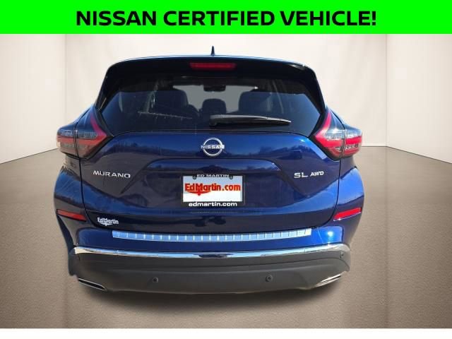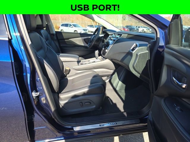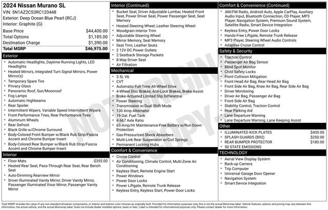 Deep Ocean Blue 2024 Nissan Murano SLONE OWNER!, BALANCE OF FULL FACTORY WARRANTY., NISSAN CERTIFIED VEHICLE!, GREAT VEHICLE HISTORY!, NAVIGATION!, FULLY SERVICED AND READY TO GO!, BLUETOOTH!, USB PORT!, REARVIEW CAMERA!, HEATED SEATS!, CLEAN CARFAX!, CARFAX ONE OWNER!, LEATHER SEATING!, POWER MOONROOF!, Murano SL, CVT with Xtronic, AWD. Odometer is 4053 miles below market average! 20/28 City/Highway MPG Nissan Certified Details:* Roadside Assistance* Warranty Deductible: $100* Limited Warranty: 84 Month/100,000 Mile (whichever occurs first)* Transferable Warranty* 7 Year/100,000 Mile Limited Warranty, 24/7 Hour Roadside Assistance, Carfax Vehicle History Report, Plus 1 Year Pre-Paid Maintenance Included. Gas Powered Nissan Models Only.* Vehicle History* 167 Point InspectionWell Equipped with: Murano SL, Nissan Certified Certified, CVT with Xtronic, AWD, 11 Speakers, 4-Wheel Disc Brakes, 4.667 Axle Ratio, ABS brakes, Air Conditioning, Alloy wheels, AM/FM radio: SiriusXM, AM/FM/CD/MP3/WMA Audio System, Auto High-beam Headlights, Auto-dimming Rear-View mirror, Automatic temperature control, Blind Spot Warning, Brake assist, Bumpers: body-color, Carpeted Floor Mats & Carpeted Cargo Mat, CD player, Child-Seat-Sensing Airbag, Compass, Delay-off headlights, Driver door bin, Driver vanity mirror, Dual front impact airbags, Dual front side impact airbags, Electronic Stability Control, Exterior Parking Camera Rear, Four wheel independent suspension, Front anti-roll bar, Front Bucket Seats, Front Center Armrest, Front dual zone A/C, Front fog lights, Front reading lights, Fully automatic headlights, Garage door transmitter: HomeLink, Heated door mirrors, Heated Front Bucket Seats, Heated front seats, Heated rear seats, Heated steering wheel, Illuminated entry, Illuminated Kick Plates, Illuminated Kick Plates (PIO), Knee airbag, Leather steering wheel, Leather-Appointed Seat Trim, Low tire pressure warning, Memory seat, Navigation system: NissanConnect with Navigation and Services, NissanConnect featuring Apple CarPlay and Android Auto, Occupant sensing airbag, Outside temperature display, Overhead airbag, Overhead console, Panic alarm, Passenger door bin, Passenger vanity mirror, Power door mirrors, Power driver seat, Power Liftgate, Power moonroof, Power passenger seat, Power steering, Power windows, Radio data system, Rear anti-roll bar, Rear Bumper Protector, Rear reading lights, Rear seat center armrest, Rear side impact airbag, Rear window defroster, Rear window wiper, Remote keyless entry, Security system, Speed control, Speed-sensing steering, Speed-Sensitive Wipers, Splash Guards (B92), Split folding rear seat, Spoiler, Steering wheel mounted audio controls, Tachometer, Telescoping steering wheel, Tilt steering wheel, Traction control, Trip computer, Turn signal indicator mirrors, Variably intermittent wipers, and Wheels: 20 Machined Aluminum-Alloy.All of our vehicles are fully serviced and detailed to give you that New Car Experience without the New Car Price Call for details on this vehicle or any other quality pre-owned vehicle in our inventory.