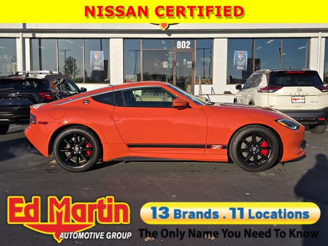 Orange 2024 Nissan Z Performance HERITAGE EDITIONONE OWNER!, BALANCE OF FULL FACTORY WARRANTY., NOT A RENTAL UNIT!, NISSAN CERTIFIED VEHICLE!, GREAT VEHICLE HISTORY!, NAVIGATION!, FULLY SERVICED AND READY TO GO!, BLUETOOTH!, USB PORT!, REARVIEW CAMERA!, HEATED SEATS!, NISSAN CERTIFIED!, CLEAN CARFAX!, CARFAX ONE OWNER!, LEATHER SEATING!, HERITAGE EDITION!!. Odometer is 2684 miles below market average! Nissan Certified Details:* Transferable Warranty* 7 Year/100,000 Mile Limited Warranty, 24/7 Hour Roadside Assistance, Carfax Vehicle History Report, Plus 1 Year Pre-Paid Maintenance Included. Gas Powered Nissan Models Only.* Warranty Deductible: $100* 167 Point Inspection* Roadside Assistance* Vehicle History* Limited Warranty: 84 Month/100,000 Mile (whichever occurs first)Well Equipped with: Floor Mat Package (First Aid Kit), Heritage Edition (Wheel: 19 Watanabe Style Alloy), Nissan Certified Certified, 4-Wheel Disc Brakes, 8 Speakers, ABS brakes, Air Conditioning, Alloy wheels, AM/FM radio: SiriusXM, Auto High-beam Headlights, Auto-dimming Rear-View mirror, Automatic temperature control, Blind Spot Warning, Brake assist, Bumpers: body-color, Compass, Delay-off headlights, Driver door bin, Driver vanity mirror, Dual front impact airbags, Dual front side impact airbags, Electronic Stability Control, Emergency communication system: NissanConnect Services, Four wheel independent suspension, Front anti-roll bar, Front Bucket Seats, Front Center Armrest, Front reading lights, Fully automatic headlights, Garage door transmitter, Heated door mirrors, Heated Front Bucket Seats, Heated front seats, Heritage Edition (K11), Illuminated Kick Plate - Black Metallic, Interior Door Scuff Protection, Leather Shift Knob, Leather steering wheel, Leather-Appointed Seat Trim, Low tire pressure warning, Navigation system: NissanConnect with Navigation and Services, Occupant sensing airbag, Outside temperature display, Overhead airbag, Panic alarm, Passenger door bin, Passenger vanity mirror, Power door mirrors, Power driver seat, Power passenger seat, Power steering, Power windows, Radio data system, Radio: Bose Audio System w/8 Speakers, Rear anti-roll bar, Rear window defroster, Remote keyless entry, Security system, Speed control, Speed-sensing steering, Spoiler, Steering wheel mounted audio controls, SynchroRev Match, Tachometer, Telescoping steering wheel, Tilt steering wheel, Traction control, Trip computer, Turn signal indicator mirrors, Variably intermittent wipers, Voltmeter, and Wheels: 19 RAYS Super-Lightweight Forged Alloy.All of our vehicles are fully serviced and detailed to give you that New Car Experience without the New Car Price Call for details on this vehicle or any other quality pre-owned vehicle in our inventory.